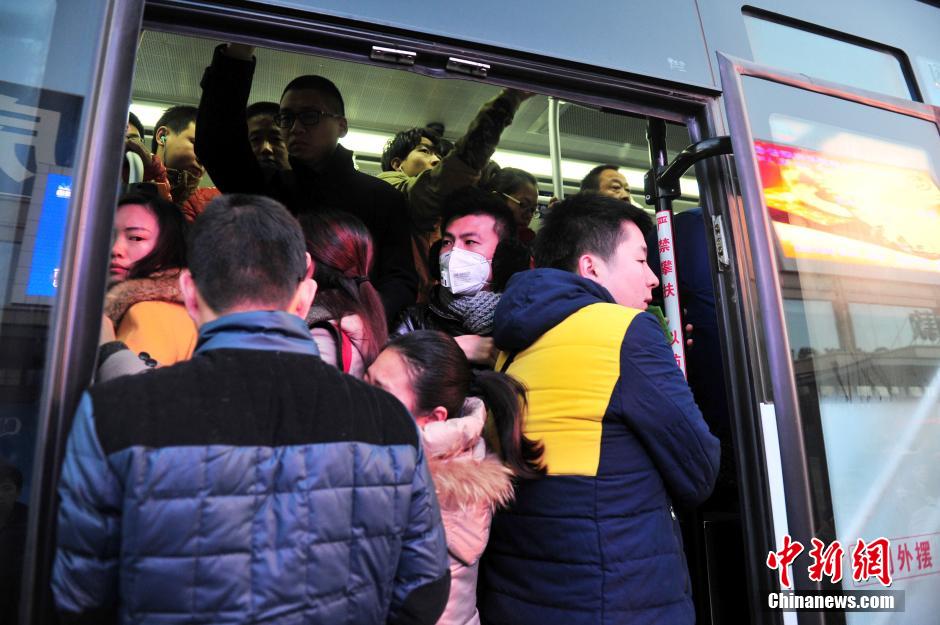 12月11日清晨,位于河北燕郊的燕灵路口公交站,前往北京的上班一族正焦急的等待着,其中有当地人在京工作的,也有北京人在当地居住的。这座紧靠北京的城市,距离天安门只有30公里,西北距首都机场25公里。约有30万在北京工作的上班族,他们每天披星戴月,奔波于北京与燕郊之间。京津冀交通一体化的推进,一定程度上方便了候鸟们的“双城生活”。目前,每天往返两地的公交车已开通12条线路,车辆超过2000个班次,站点和路线也在持续完善。图为赶去北京上班的市民拥上公交车。 翟羽佳 摄