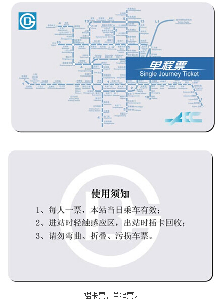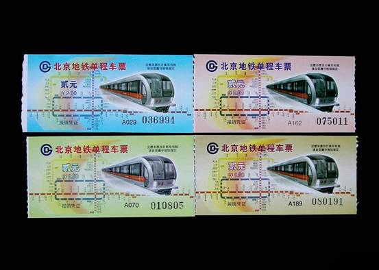 ■ 2002年年底北京地铁车票实行色标管理。其中地铁1号线车票颜色为粉红色;2号线(包括2个换乘站)车票为湖蓝色。