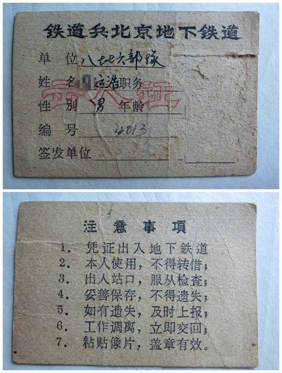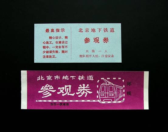 照片上面的一张是地铁一号线的参观券,该参观券于1969年10月1日启用。由于属于战备工程,北京地铁在通车后很长时间内不对公众开放,需凭介绍信参观及乘坐。