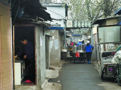 沿着胡同向北走,映入眼帘的是一片破旧的小平房。七拐八拐,两辆三轮车在一个不起眼的平房门前停下,几个人把车上的厨具搬了进去。透过门朝里看,这是一个狭窄的小院,墙壁有些发黑,地面也有污迹。笼屉被搬进了屋,粥锅和炉子就放在小院黑漆漆的角落里。
