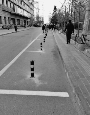 1月5日,记者来到国际港小区看到,门口两侧新划了十几个车位,而该路段并无停车场指示牌,令人纳闷的是,每个车位里还都打了两三个黄黑相间的防护桩,让这条只有6米宽的路秩序混乱,骑车人只能和机动车抢行。“元旦那天一早,就出现了这十几个车位,应该是有人晚上划的。”小区居民刘先生讲述。
