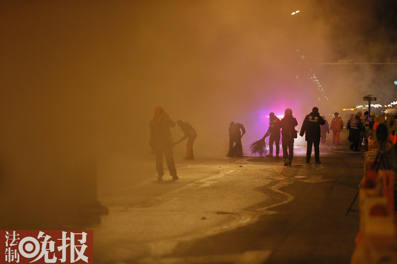 记者在现场看到消防队员和热力维修人员均已赶到。热水流在新闻大厦前的大街上形成近百米白雾。