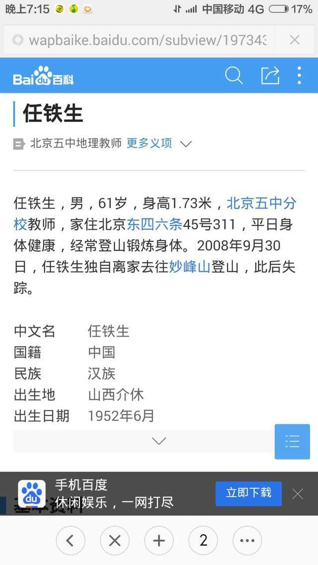 任铁生,北京五中分校男教师,平日身体健康,经常登山锻炼身体。2008年9月30日,任铁生独自离家去往妙峰山登山,此后失踪。