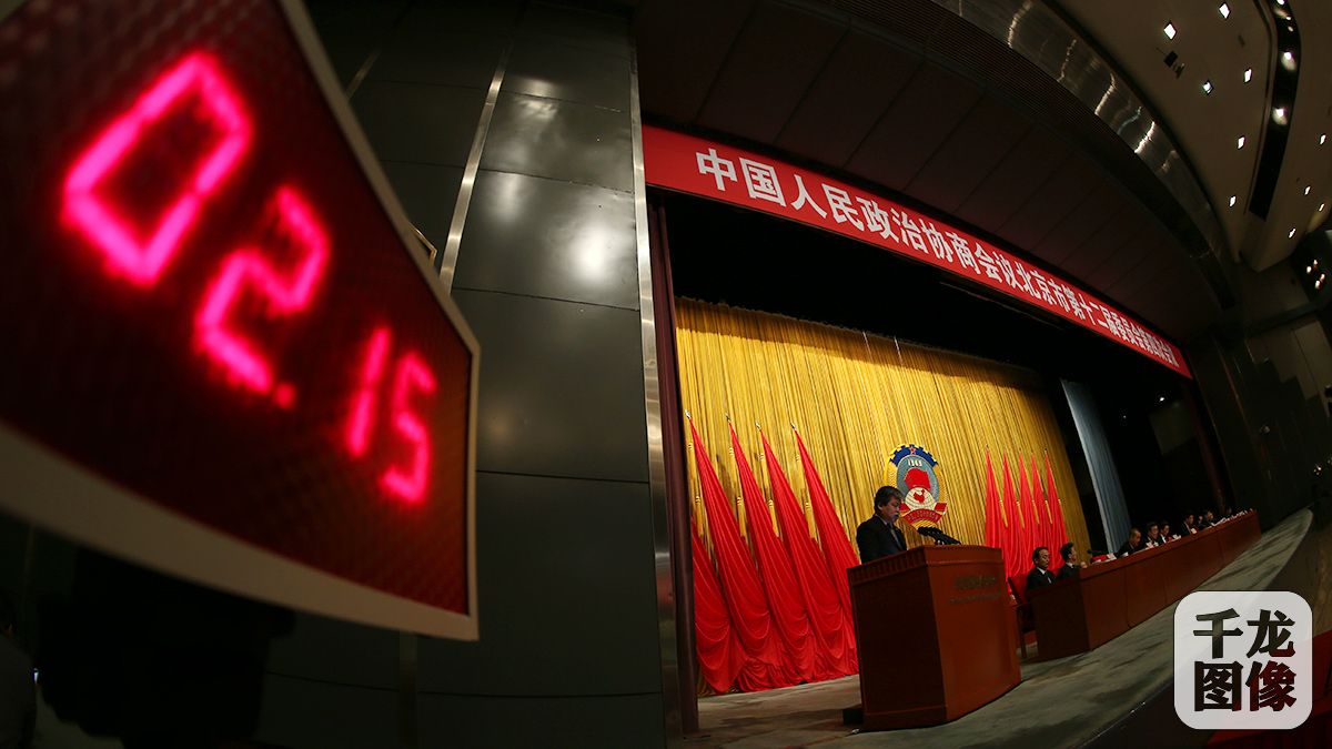 1月23日,政协北京市第十二届委员会第四次会议举行大会发言,每名委员发言限时7分钟。图为主席台旁设立计时器。千龙网记者 戚连民摄