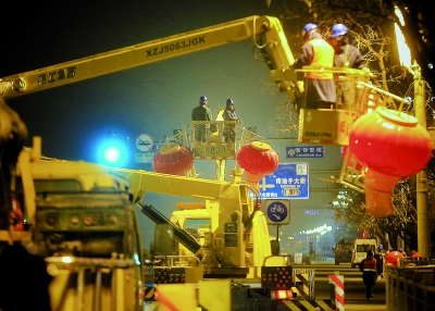 1月27日凌晨,工人在长安街安装红灯笼 摄/记者 柴程