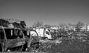 昨日上午,北京晨报记者来到大洋路农副产品批发市场蔬菜区,还未走近起火处便闻到呛人的焦煳味,地上水迹也大面积凝结成冰。市场内管理人员正在用彩色塑料布将二十多辆被损毁的货车围起来,塑料布上张贴有封闭火灾现场公告。记者看到,被围起来的二十多辆车均为厢式货车,车头部分损毁十分严重,部分货车车头只剩下金属框架,许多货车的轮胎也被烧焦(如图)。货车旁边空地上烧毁的烂白菜堆成小山,货车车厢里装着的大白菜、辣椒、豆角等蔬菜外面也被烧焦,有几位菜商正刨开车厢最外侧的蔬菜,“拯救”包裹在车厢最中间未被烧毁的蔬菜。