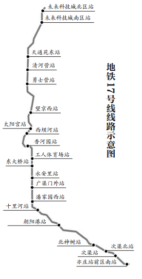 从规划图上看,地铁17号线穿越昌平、朝阳、东城、通州4个区,连接昌平未来科技城和亦庄新城,中间又途经天通苑、望京、太阳宫、潘家园等人口密集的城市居住区,全长49.7公里。线路总体呈“L型”,南起通州区环渤海总部基地南站——亦庄新城站前区,经过光机电总部基地、规划朝阳港后沿大羊坊路向西北方向敷设进入十里河地区,之后线路沿左安路、潘家东路进入潘家园、广和里地区,继续向北下穿通惠河,经永安里后进入东大桥路、新东路敷设,下穿机场高架桥后线路转向西,在东直门北转向西北,沿西坝河南路、太阳宫中路向北进入太阳宫,之后线路下穿太阳宫体育休闲公园后转入京承高速,下穿五环路后转向西进入北苑东路,沿北苑东路向北至北苑东侧、天通苑地区,继续向东北沿现状九厂路经燕丹镇后进入昌平区未来科技城地区。