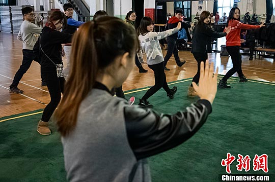 2月1日,两岸青年学生在北京的首都体育学院学习武术。中新社记者 熊然 摄