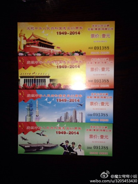 2014庆祝中华人民共和国成立65周年纪念车票(网友供图)