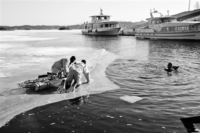 此次训练过程中,潜水员们还进行了冰潜极限测试。赵队长告诉记者,潜水服防水但不保温,要靠里面穿的棉衣裤保持体温,而潜水员的脸部和双手还是要接触水的,尤其是手,在冬季的冰水里时间一长就不听使唤了。这次极限测试主要就是测验潜水员在水下多长时间出现“寒战反应”,让每个人对自己在冰冷的水下能呆多长时间做到心中有数,以便在参与救援时能够在自己出现不适前及时上浮出水,避免发生不必要的危险。测试结果是,14名潜水员在冰下保持时间平均为30分钟左右,都能满足冰下救援任务需要。