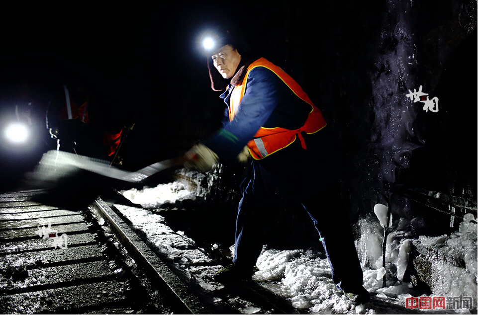 张庆华把水沟里多余的冰块铲到铁轨另一头。