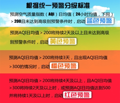 如在试行统一标准期间出现空气重污染,两种条件下即可启动红色预警:一是有四天及以上重度污染且其中至少有两天达到严重污染;二是四天及以上重度污染中,有一天及以上的空气质量指数达到500“爆表”级别,就可以启动红色预警。专家指出,统一的分级标准中,橙色以及红色预警的门槛都有所提高。