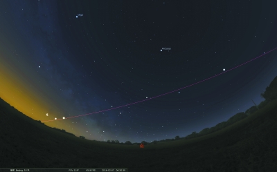 黎明前,当你向南方的夜空望去,在西南偏西的方向有一颗明亮的星星,那是木星。在木星东侧,一颗红色的星位于正南方的天空,那是火星。顺着这条线依次向东望去,你会发现土星和最明亮的金星悬挂天际。接下来,如果你眼力够好,外加天公作美,就有机会发现一颗较为黯淡的星辰挂在东南方地平线上,靠近明亮的金星,那就是水星。