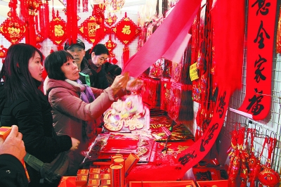 昨天(7日),北京市民在海淀区一家市场选购春联、年画、窗花、红灯笼等年货。农历除夕,北京各大市场供应充足,品种丰富,年节商品供需两旺。本报特约摄影 穆景林