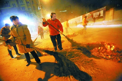 昨天(7日),在德外黄寺大街附近,来自四川的环卫保洁职工、57岁的李宇清与妻子李翠华和保洁队的62名环卫保洁员及家属一同清理爆竹皮。自从2009年来到队里,他已经7年没有回家过年了。德胜街道保洁队里有来自四川、河南、山西、山东等12个省的近70名保洁员,他们负责着78条街道、48万平方米的保洁任务。本报记者 方非摄 通讯员 刘辰文