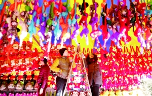 昨天(7日),地坛庙会的工作人员在进行开园前的景观布置。一个游艺项目摊位挂满了毛绒猴玩具。北京晨报记者 李木易/摄