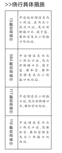 记者从公交集团获悉,根据交通管制措施,今天(8日)首班车至16时,雍和宫大街由雍和宫桥下路口至北新桥路口禁止机动车通行,途经该路段的13路、116路、117路、684路4条线路将采取绕行措施。地铁方面,今天地铁2号线雍和宫站、5号线雍和宫站自首班车起至17:30时止封站。封站期间,2号线、5号线各次列车在雍和宫站通过不停车。记者黄海蕾