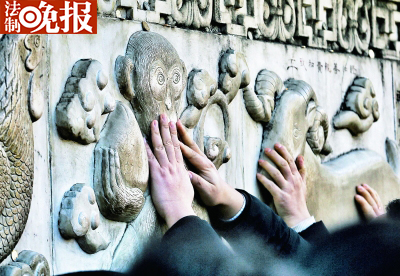 游客抚摸生肖壁上的石猴祈福。柴程 摄