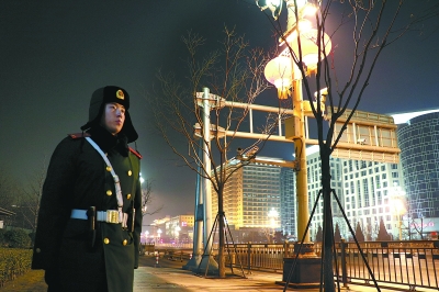 除夕之夜的长安街,如往常一般灯火通明,却没有了平时的车水马龙。这条繁华热闹的大街,在大年夜的凌晨1点格外宁静。武警北京总队一支队的班长张龙与新战士张晋就在这闪烁的霓虹下,迎来了新年的第一班岗。他们刚吃完饺子,就走出营门,站在寒风中执勤。除夕夜,该支队将有千余名武警官兵为京城守岁,确保京城人民度过一个欢乐、祥和的除夕夜。
