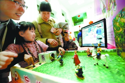 2月13日,在中国科技馆,小朋友们和家长一同根据视觉暂留原理拍摄《西游记》动画片。本报记者 饶强摄