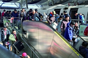 2月16日,在北京南站,乘坐高铁抵达北京的旅客出站。 北京晨报记者 柴春霞/摄