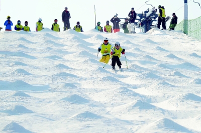 “猫跳”滑雪是指自由式滑雪雪上技巧。1994年冬奥会将这一项目列为正式比赛项目。滑雪者在极陡、满是雪包的场地上利用纯熟的转弯技巧,争取用最快的速度滑完全程,而且在滑行中还要跃起到空中进行空中造型表演。