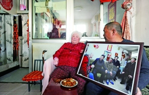 走进居民李旭钧家,他快88岁的老母亲王云凤坐在正对电视的椅子上,就像两年前习总书记来到家里时那样。在当时留下的一张照片中,总书记握着老人的手,正和她聊天。因为年纪太大,老人已无法复述当时的场景,李旭钧把照片拿过来,靠近母亲的耳朵问:“您还记不记得这张照片啊?”老人立刻笑着点头(上图)。