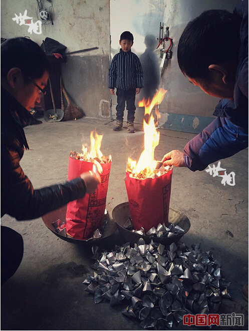 家中年前都要祭祖,牛魔王远远的看着爷爷伯父烧元宝。