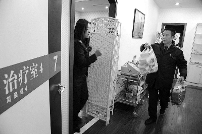检查人员将美容院涉嫌违规的美容药品带走检验 摄/记者 林晖
