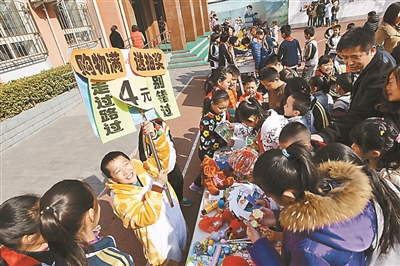 义卖现场,小小“商家”的策略成为最大的亮点,几乎每一班都有精心布置的营销策略和标语,“商品之最,价格巨惠。四中一队,永福不亏”,“买满5元,加1元,换本子一个;满8元,加2元,送图书一本”……还有班级直接派出“形象代言人”,穿着一身麋鹿装“上街”吆喝。虽说是学校第一次举行大型义卖,但商品上规范的价签、专人记账本、最后的清仓甩卖处理等等,都体现了大家义卖的“专业”性。