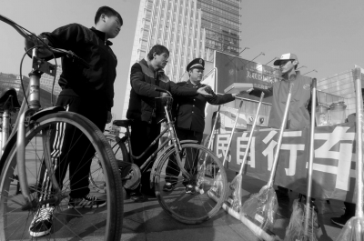 3月2日下午,在双井地区开展的幸福双井“益起来”的社区公益活动中,双井城管队推出“僵尸自行车”换购日用品活动。据城管工作人员介绍,换来的自行车并不是当废品处理掉,而是联合有关公司,将这些自行车重新修理后供居民免费使用。目前,已经在大望路、双井家乐福、双花和后现代城设置了4个租借点,已经投入了300多辆自行车。每天早7点到晚上7点半,市民可以凭借身份证免费租车,然后在这些租借点通借通还。具体情况,可以关注“双井公共自行车”(shuangjing_bike)微信公众号了解。