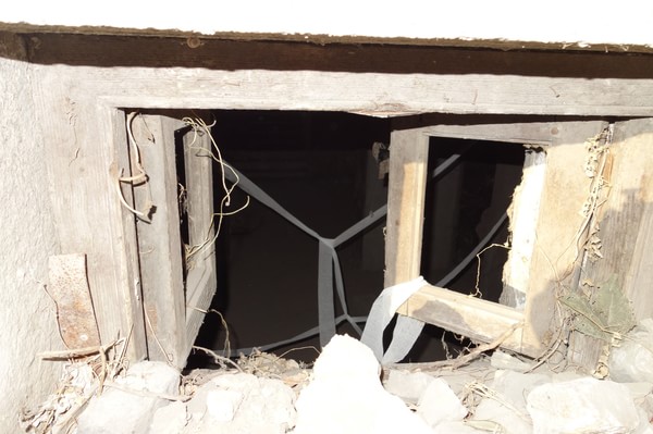 透过东楼一扇破旧的窗口口望向地下室。里面挂满了白色的绳子看起来异常恐怖