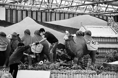 日前,第四届农业嘉年华开始布展,两名工人正在布置“丝路蔬语”展厅内由蔬菜和豆类组成的“丝绸之路”景观。 本报记者 邓伟摄