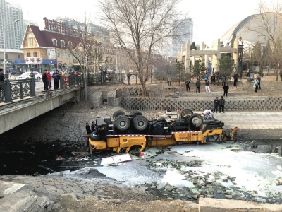 3月5日晚上11点多,朝阳区朝阳公园路,一辆中型黄色吊车倒车时撞破桥上护栏,坠入亮马河后翻车。6日晚上7点多,经5小时努力,吊车被打捞上岸。东外交通大队交警表示,事发时车内有两人,司机当场死亡,事故原因仍在调查中。