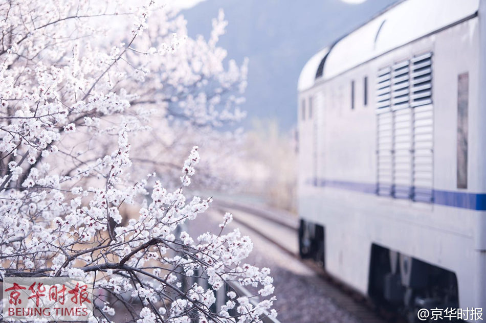 2015年04月05日,北京,清明时节,春暖花开,山坡上的杏花灿烂的绽放,迎接开往春天的列车。