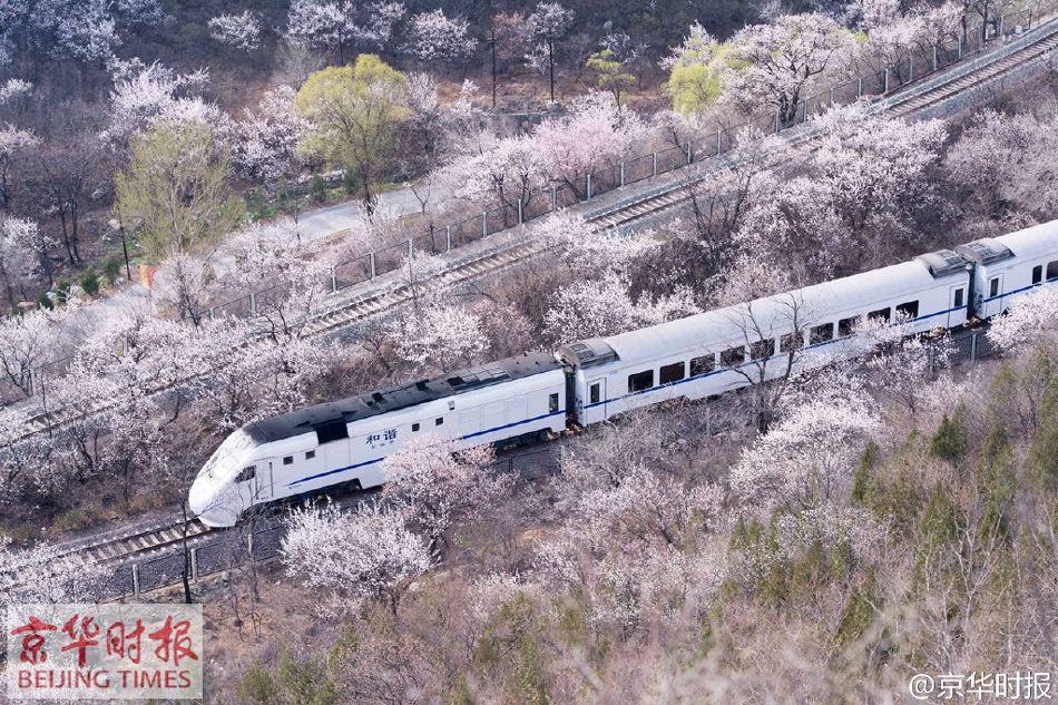 2015年04月05日,北京,清明时节,春暖花开,山坡上的杏花灿烂的绽放,迎接开往春天的列车。