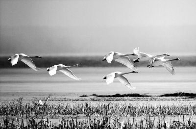 昨天,风终于小了。在巡护地点,一队队洁白的大天鹅从水库正南方向飞来。紧接着,天空中出现大批灰鹤,陆续降落在水库岸边的玉米地里和还没有融化的冰面上。很快,灰雁、豆雁、鸿雁等种群,陆续出现在地平线上。顿时,安静的水面上热闹了起来。鸟群欢天喜地地梳理着羽毛,用翅膀拍打着水面。