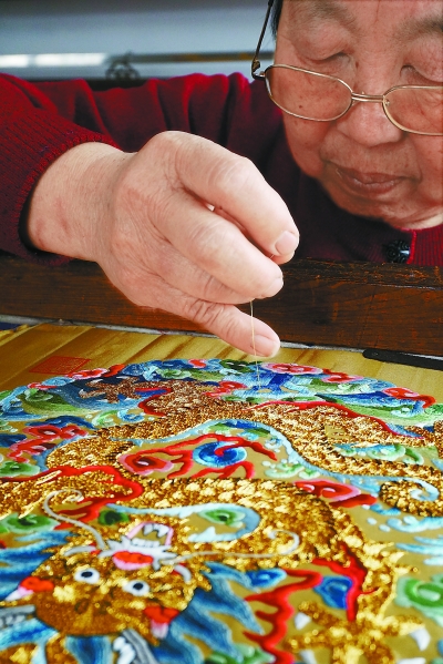 房山区琉璃河镇刘李店村,65岁的刘秀花坐在绣架前飞针走线,金黄色的绣缎上出现一条栩栩如生的金龙,阳光从玻璃窗中投射下来,绣缎呈现出独有的光晕。