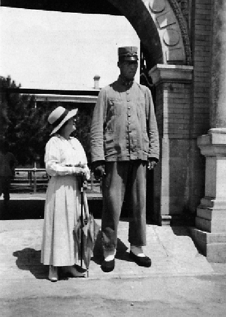 1910-1940年代,万牲园先后雇佣四个2米多高的“长人”在门口检票,成为当时一景。这幅照片是一位外国女士在万牲园门前与检票的“长人”合影