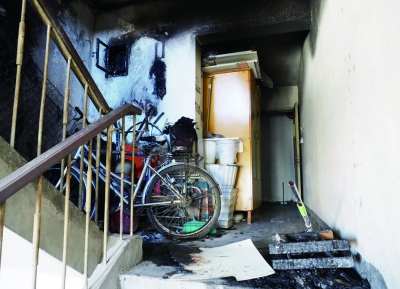 过火后楼道内一片狼藉 摄/记者 石爱华