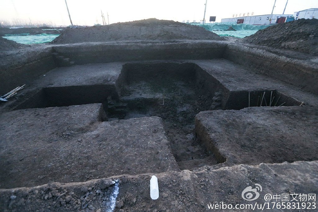 3月13日,北京行政副中心工地胡各庄村委会南边的空地里发现汉代墓葬群,工作人员正在现场勘测发掘。据考古人员讲,从发现的一些瓷器来看是汉墓,有几十座,从现场的情况来看,一些墓坑里的砖头比较凌乱,怀疑这些墓葬被盗过。现场被绿色的防护网覆盖着,保安值守,目前勘探和发掘工作还在继续。图片来源:中国文物网官方微博