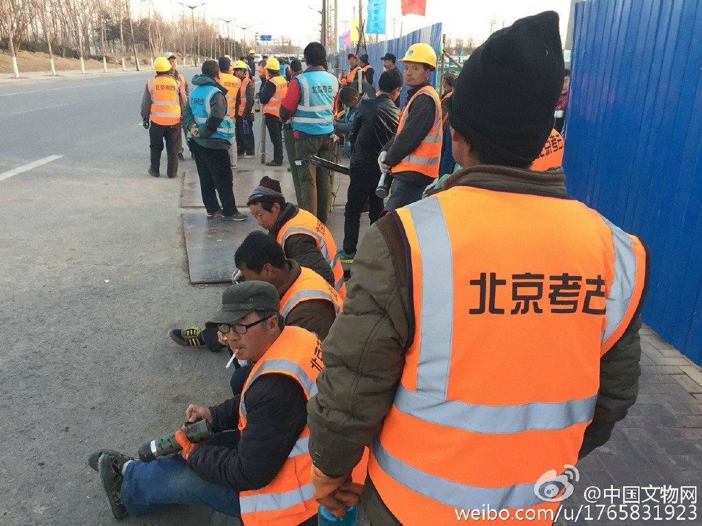 3月13日,北京行政副中心工地胡各庄村委会南边的空地里发现汉代墓葬群,工作人员正在现场勘测发掘。据考古人员讲,从发现的一些瓷器来看是汉墓,有几十座,从现场的情况来看,一些墓坑里的砖头比较凌乱,怀疑这些墓葬被盗过。现场被绿色的防护网覆盖着,保安值守,目前勘探和发掘工作还在继续。图片来源:中国文物网官方微博