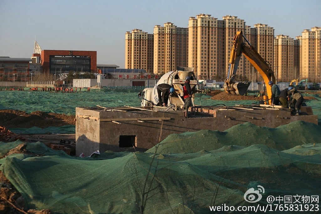3月13日,北京行政副中心工地胡各庄村委会南边的空地里发现汉代墓葬群,工作人员正在现场勘测发掘。据考古人员讲,从发现的一些瓷器来看是汉墓,有几十座,从现场的情况来看,一些墓坑里的砖头比较凌乱,怀疑这些墓葬被盗过。现场被绿色的防护网覆盖着,保安值守,目前勘探和发掘工作还在继续。图片来源:中国文物网官方微博