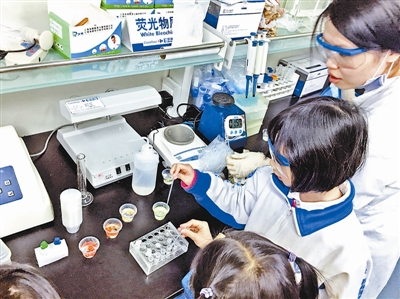 小朋友们分为两组。一组进入检测室参观,检测室人员为学生准备3个演示动手的小检测。实验一:瘦肉精检测检测,告诉同学们瘦肉精的正式名称和它的状态。并说明为何不法商贩会在肉中添加此类物质,添加后被食入到人体中会产生怎样的危害。指导学生们自己动手检测所取样品中是否还有瘦肉精类物质。