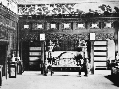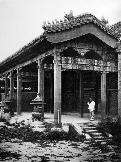 一名太监站在养心殿前殿抱厦前,摄于1900年。