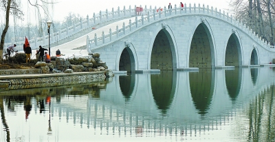 经过一年多的断路施工,玉渊潭公园中堤上一座新的仿古五孔石桥已完工,将在本月樱花节前恢复通行。 庞铮铮摄