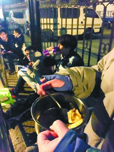 戴眼镜的小伙子身边,还有几个满嘴京腔的年轻人,其中一个端着饭盆正吃馄饨。“家里人给送来的。我请了两天假,专门来排队。”话音没落,他的妻子端起另一个饭盆说:“这儿还有热的呢,多吃点吧。”