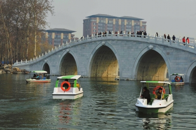 此外,北方最大樱花节也将于本月中旬在玉渊潭开幕,中堤桥的落成开通也将为广大市民游客樱花节期间游园提供便利。玉渊潭公园东西两湖面670余条游船昨天正式开航。目前公园东西两湖共有四个游船码头,现有电瓶、脚踏、黄鸭、单双轮等13个船种670余条游船。今年公园还新引进了30条流线型四人豪华电瓶船,游客将可以乘船穿行东西两湖,观赏到公园着力打造的“千米樱堤”景。