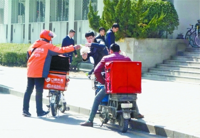 在写字楼忙于职场拼杀的白领常常没有工夫下楼吃饭,于是可以送到电梯口的便当帮了大忙,餐饮外卖由此兴起。近年来,获得了资本支持的外卖订餐O2O项目层出不穷,各种APP竞争激烈。在北京,拥有几十万师生的大学校园自然不可能是一方净土。记者日前走访北京大学、清华大学、中国人民大学等十多所高校发现,大学生叫外卖已经非常普遍。从早晨到夜里,各种送外卖的电动车穿梭校园,已成为校园里一道流动的风景。