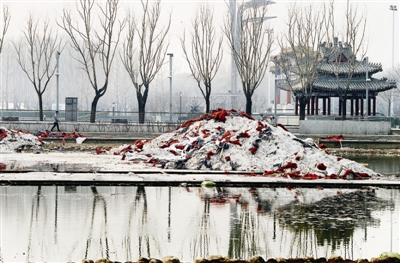 随着这几日气温升高,北青报记者看到,湖中的积雪已经化掉,湖面的南北段都有由绿色编织袋堆积成的“小山头”,湖面两岸也堆满了废弃物。水面上漂浮着一些广告纸、木板和冰雪节时用的红灯笼,还有大量灰色颗粒物。